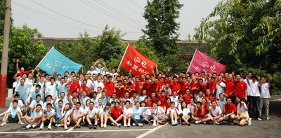 行军途中,队伍始终保持着整齐的队形和高昂的士气,时而起步前进、时而小跑行进。雨一直在下,队员们身上已分不清汗水与雨水。随着拉练距离的延伸,有的队员开始感到体力的困难。在风中猎猎飘扬的团队红旗,回荡在队伍的上空的嘹亮歌声,又不断地激励着团队的所有队员克服一切的困难,向前,向前……