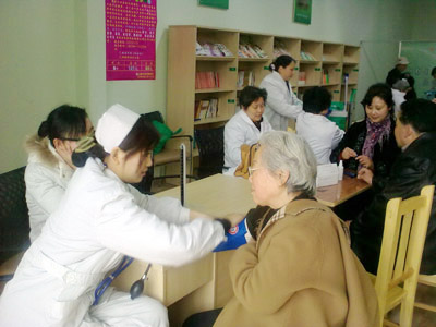 清晨,柳城谊苑客服中心的员工热情的接待着前来咨询的为老爷爷、老奶奶,搀扶他们坐好,为他们端凳倒水;成都市老年病医院派来了10余名医务人员,在他们给医生反映自己的身体情况后,医务人员认真、仔细地为老人朋友们检查身体的同时,耐心的向他们解释,让每个老人都真正的了解到自己的身体健康状况。有的老年朋友还准备了笔记本,一一的记下医生所说的。空暇之余,医务人员还和老人们聊起天来。