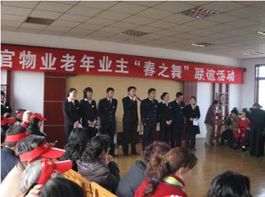 现场,锦官物业为业主们组织了一场丰富有趣的联谊活动,写意的锣鼓声、欢快的秧歌舞、抽奖、趣味游戏、交谊舞……在活动中通过各种游戏来带动了业主的积极性,使业主竞相上台与演员互动表演节目,纷纷展示自己的才华,最后的交谊舞更是将活动推向高潮,在工作人员的邀请下业主们纷纷踏入舞池翩翩起舞,伴随着美妙的舞曲联谊活动结束......下午,物业公司又组织不同兴趣爱好的业主分别开展了棋牌、品茶、赏梨花沟等活动,整个活动过程物业公司的工作人员始终伴随着他们,为业主们提供周到、细致的服务.