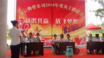 此次活动历时三个半小时,联谊会所有的节目都是由公司员工自编自演,小区业主积极踊跃报名参加。联谊活动以知识竞赛、文艺表演、团队拓展训练三个环节为主。在知识竞赛过程中,公司分为行政后勤、公共物业、住宅物业三支参赛队,知识竞赛以企业文化、物业知识、《弟子规》问答为主要内容,三支参赛队各具特色,各有所长,参赛队员信心百倍、胸有成竹,争先抢答,参赛队员标准流利的回答,赢得了现场的掌声和喝彩声,场面异常火爆,显示了员工对公司企业文化、物业管理知识和《弟子规》内容的充分掌握,同时也给员工创造了一个取长补短和交流学习的平台。随着活动的陆续展开,员工和业主开展了丰富多彩的文艺节目,以多姿多彩的歌舞、精彩的才艺展示、富有诗情画义的诗歌朗诵等节目获得了员工、业主的一致好评。为了增强团队协作精神,在最后的活动中开展了紧张激烈的拓展训练,员工、业主集中排队、统一编组、统一实施,增进了员工、业主之间的友谊,激发了大家团结友爱、勇于拼搏的信心和决心,增强了团队的凝聚力。展现了公司员工和业主团结向上的精神风貌,陶冶了情操,对瑞云物业公司有了更加深刻的认识。