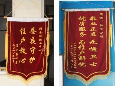 科恒置业顾问有限公司金堂分公司的水韵金沙项目和金晖花园业主为感谢秩序维护队队员的尽心尽职,特制作锦旗以表谢意。