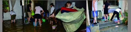 9:00,雨量减少,洪水开始退去,全员集合,游总将大家分成数个小组,分别负责积水业主房屋地下室清扫工作。