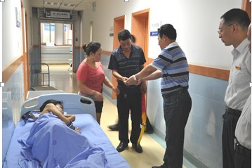 2013年8月15日下午,成都德冠物业管理有限公司总经理汪茂志带队前往郫县中医院看望了德冠公司技师学院物业服务中心秩序维护员工邱崇华的妻子,并将公司全体员工的爱心捐款送到邱崇华的手中。