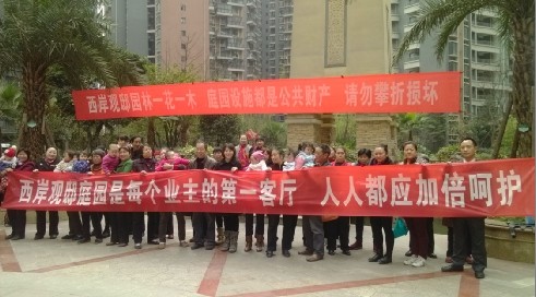 3月初,物业服务中心与业主委员会做了前期的联合宣传,12号下午2时, 50多位业主齐聚钟楼前等待活动开始。活动由客服主管李雪梅主持。在活动中设置了一些有奖问答题,与业主进行了互动、宣传了植树节的来历及意义;随后参加活动的人员还在“西岸观邸庭院是每个业主的第一客厅,人人都应加倍呵护”横幅上签名,以表爱护家园、维护绿色庭院的决心;客服人员将业主用“心”写下对小区绿色寄语,“小草有情,脚下留情”、“像呵护宝宝一样爱护自己的家园”等感动的“心卡片”经过塑后挂在了一棵棵桂花树上,闪动着绿色的真情;活动最后一项,组织在场所有业主进行了园区垃圾、落叶的拾检,带走的是垃圾,传递的是环保与爱心,树立了人人保护家园、珍爱庭院、共建共管第一客厅的良好风尚。