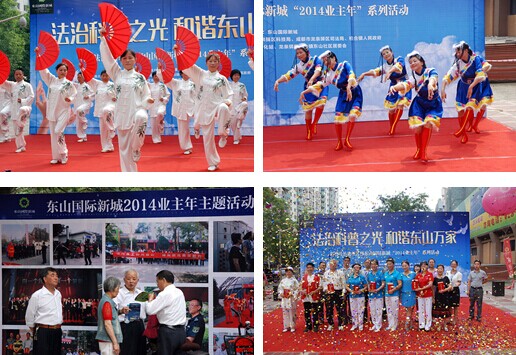 上午9:30,活动正式开始,首先由华信天宇营销总监陈丽娟致辞,介绍了东山国际新城既“一生之城”的开发理念和概况,感谢东山国际新城业主一直以来的信任与大力支持。然后由司法局和科技局相关负责人进行了相关的法律和科技知识宣传,现场为观众解答相关法律问题,提倡业主遇事处事依法依理,共建共创共享和谐法治小区。随后由东山国际新城9支业主兴趣小组:太极、舞蹈、骑游、古琴、健身体操、腰鼓、毽球、合唱及交谊舞队为现场观众带来了一场多姿多彩的文艺才艺汇演,通过快板、歌唱、舞蹈等多各种方式让小区业主在轻松愉快的氛围中,体验入住东山国际的和谐与幸福,感受科普和法律知识潜移默化的影响。在活动过程中还穿插了科普法制知识有奖问答,向广大业主宣传了科普、法制和物业管理相关知识。