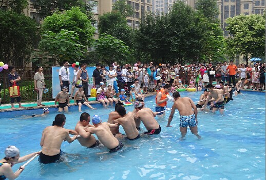 下午两点,活动现场已经有不少大人和孩子迫不及待地换上了泳衣跳入水中嬉戏,整个现场一派夏季清凉休闲的景象。为加深业主彼此之间的友谊,让大家在清凉中享受更多快乐,公司还为广大业主准备了水中捞球猜谜、吃西瓜比赛、水中拔河、你抛我接、以及水中顶球接力5个趣味游戏项目。