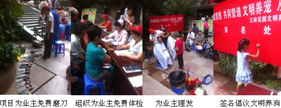 中秋前,公司联络了一批社会志愿组织为小区业主送福利,学雷锋,通过为业主提供免费的磨刀、理发、检查身体以及组织员工献血等活动拉近了与业主的距离,许多业主口口相传,并希望这样的活动能够长久、持续的进行下去。