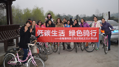 2015年3月7日,成都合智商务服务有限公司组织公司全体女员工自行开展了各样的“三八”妇女节活动。其中,职能部门和绿舟片区的美女们穿上靓丽的休闲装,开始了为期一天的烧烤骑游活动。虽然活动前晚下过春雨,路面稍显湿滑,但这样的路况并不影响美女们骑车玩乐的心情。瞧!淑女车上美女的回眸一笑悠然挥手;双人脚踏车上一人掌舵,一人加足马力的飒爽英姿,无一都在体现我合智职业女性的别样风采。