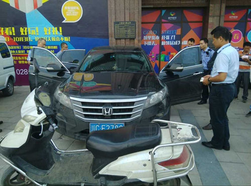 经管理处现场勘查,发现广场上一辆黑色本田车门开着且有被撬过的痕迹。经监控确认,是对方开来3辆车之一,价值人民币三十多万元。管理处立即报告公安机关,与民警一起通过车内的一张电话续费单联系上车主,并由管理处安排专人看守该车辆。