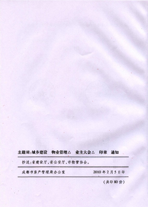 上一条:成都市房产管理局关于印发《成都市业主大会设立操作表格(示范文本)》的通知 下一条:关于举办“展女性风采 抒物管情怀”三八妇女节演讲比赛的通知