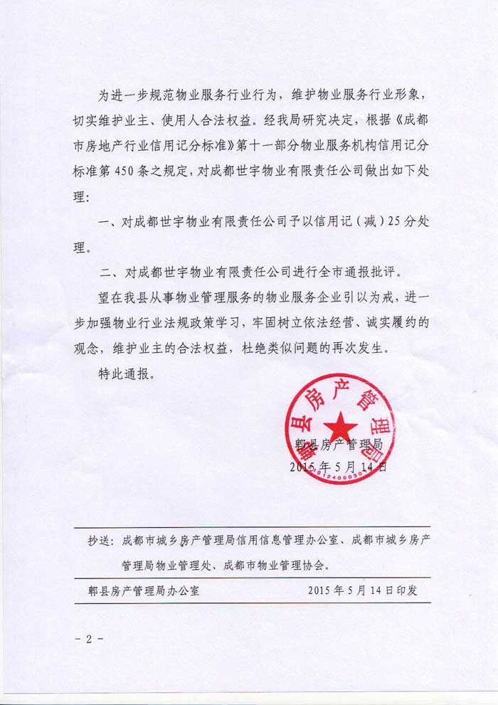 上一条:关于对成都蜀信物业服务有限公司等5家企业予以表扬的通报 下一条:关于对成都合力物业服务有限公司的通报