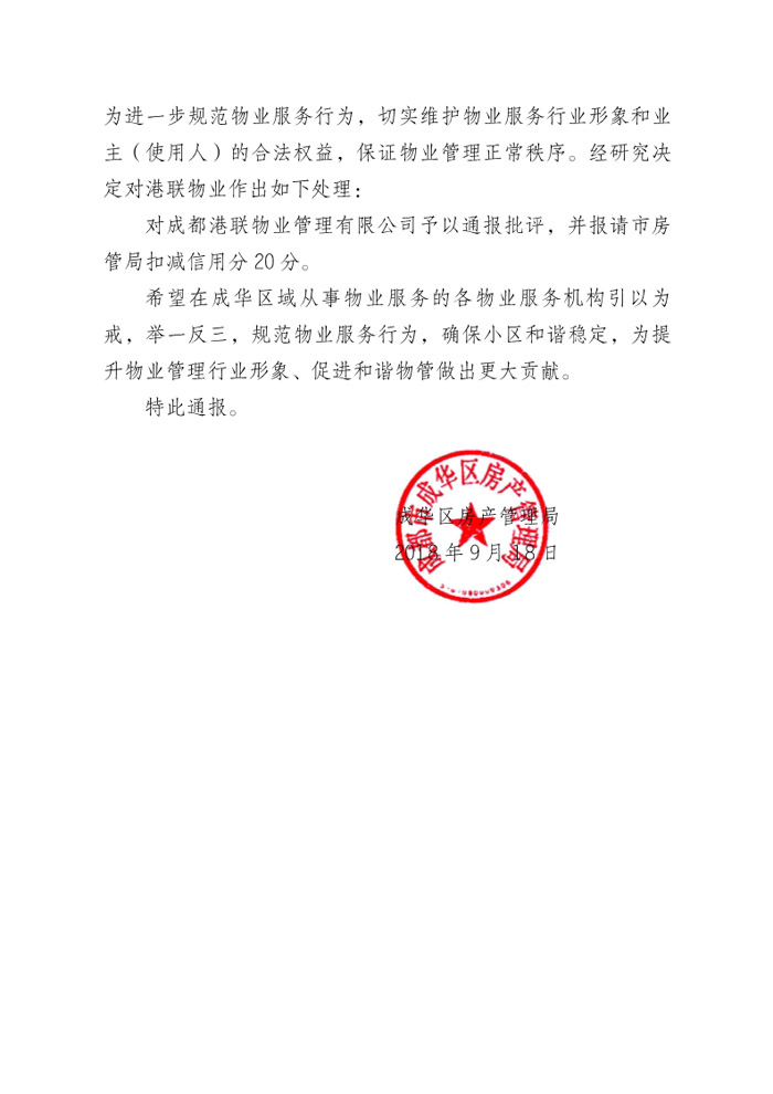 上一条:关于对成都中南物业服务有限公司的通报 下一条:成都市城乡房产管理局关于启动2018年度第二次物业管理大检查的通知