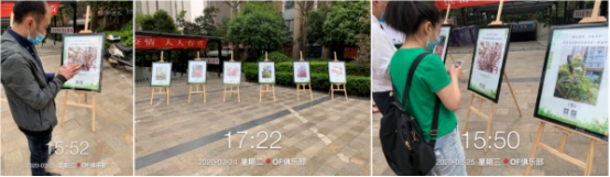 很快,居民们纷纷加入,发来了共计一百余幅摄影作品。有些画面,是小区植物的春芽;有些画面,是邻居们的笑脸。这些作品打印出来后做成了画架,摆在了小区出入口,每位居民进出时,都能看到不同视角下的美丽家园。