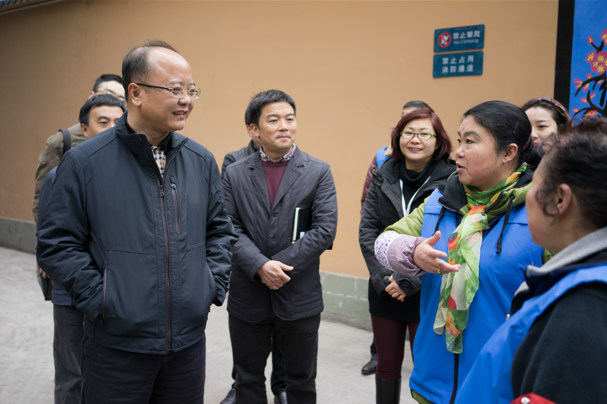 32 市房管局局长何立祥到成华区万年场街道调研指导老旧院落物业管理工作。何局长实地查看了由市物业管理协会培育打造的老旧院落物业管理标准化建设试点项目万兴街1号院,详细询问了院落改造、居民自治、物业管理和房屋维修长效机制建立等情况,并与万年场街道办事处、万年路社区相关负责人和居民代表就有关问题进行了交流探讨。市房管局分管物业管理工作的副局长李初元、局长助理王堃,成华区副区长蔡达林及市房管局物管处处长袁庆华等相关负责人陪同调研。