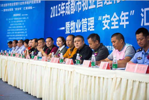 10月17日下午,由成都市物业管理协会主办的2015年成都市物业管理行业秩序维护技能竞赛暨物业管理“安全年”汇报演练活动在成都职业技术学院盛大举行。来自成都市物业管理行业的17支企业代表队和近千名物业服务人员参加了本次竞赛和汇报演练。成都市城乡房产管理局物业管理处副处长姜鲁东、调研员唐宗伟,成都市成华区房产管理局副调研员传光全受邀出席活动。成都市物业管理协会会长闻涛,副会长温文遐、陈干平、田永云、李轶梅、梁古芬、杜小云、曹毅、李立新,秘书长巫庆敏等领导出席活动。竞赛评委由唐宗伟调研员、传光全副调研员、温文遐副会长,以及特邀嘉宾四川时尚职业培训学校副校长宾冰,成都市公安局交通管理局第一分局警官赵亮华担任。
